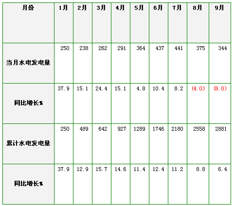 導(dǎo)語:2006年9月,水電來水偏枯的情況仍在持續(xù),同時受夏季用電高峰結(jié)束、用電量減少的影響,全國水電發(fā)電量同比和環(huán)比繼續(xù)下降。當(dāng)月,全國共完成水電發(fā)電量343億千瓦時,同比減少8.0%,增速同比下降23.8個百分點。