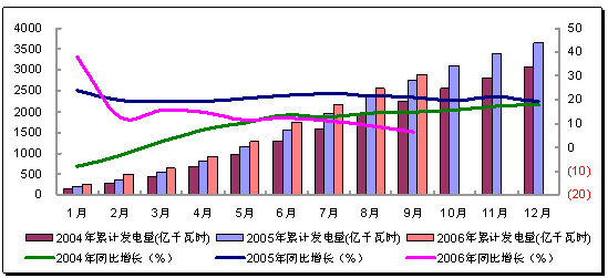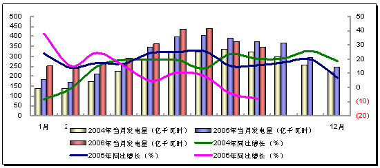 2004-2006年各月水電發(fā)電量及增長趨勢