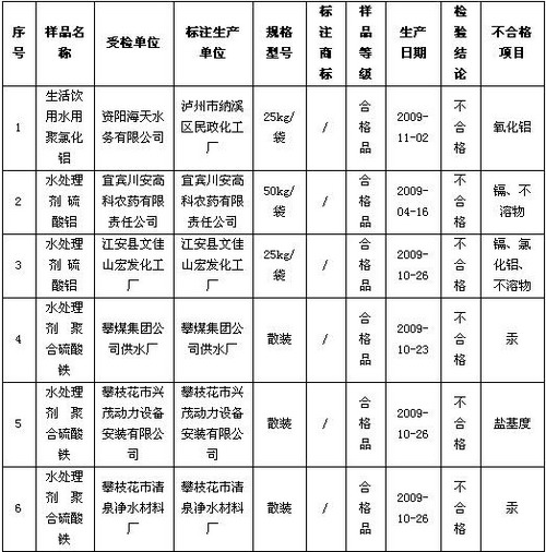 被曝光的6批次不合格產品為:標注瀘州市納溪區(qū)民政化工廠生產的生活飲用水用聚氯化鋁、標注宜賓川安高科農藥有限責任公司生產的水處理劑硫酸鋁、標注江安縣文佳山宏發(fā)化工廠生產的水處理劑硫酸鋁、標注攀煤集團公司供水廠生產的水處理劑聚合硫酸鐵、標注攀枝花市興茂動力設備安裝有限公司生產的水處理劑聚合硫酸鐵、標注攀枝花市清泉凈水材料廠生產的水處理劑聚合硫酸鐵。