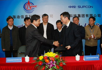 4月13日下午4:30,中海油信息科技有限公司(簡稱:海油信科)和中控科技集團(tuán)有限公司(簡稱:中控集團(tuán))戰(zhàn)略合作簽約儀式在中控科技園D301會議室舉行。出席本次簽約儀式的有中國海洋石油總公司總經(jīng)理助理、中海油能源發(fā)展股份有限公司總經(jīng)理李凡榮,中海油能源發(fā)展股份有限公司副總經(jīng)理方長傳、總經(jīng)濟(jì)師石成剛,中海油信息科技有限公司總經(jīng)理李何,副總經(jīng)理康冬森、蘇玉良,中國工程院院士、中控集團(tuán)董事長孫優(yōu)賢,浙江大學(xué)副校長褚健,中控公司高層領(lǐng)導(dǎo)金建祥、施一明,中控軟件公司總經(jīng)理蘇宏業(yè)等共計40余位嘉賓。