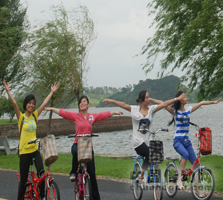 雨后的湖邊搖擺不定的樹,落了一地葉。鳥兒整理著濕漉漉的羽毛。太陽(yáng)終于撥開云霧,重放它那耀眼的光芒,使得花朵上晶瑩的水珠顯得五彩斑斕。我們就這樣騎車前行,一路閑散,賞花聽(tīng)風(fēng),嘻笑打鬧,我們愛(ài)秀的美女們?cè)诖吮M情留影,真乃美景佳人吶!