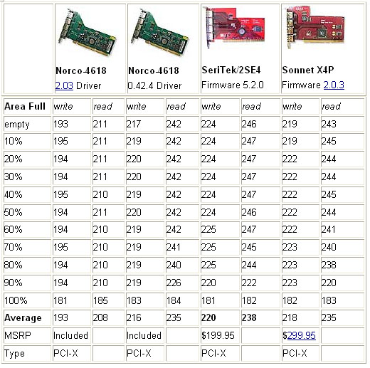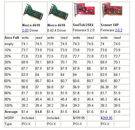 從上面的表格看來(lái), 最新的Silicon Image SiI-3124 Mac驅(qū)動(dòng)版本2.0.3并不是表現(xiàn)最好的。舊版本0.42.4速度快些,但它不支持硬盤直接連接功能,而且SILICON IMAGE已停止對(duì)舊版本的服務(wù)。有趣的是FIRMTEK公司比SILICON IMAGE公司對(duì)SILICON IMAGE的SIL3124芯片提供更快的驅(qū)動(dòng)程序,這種情形比較少見。