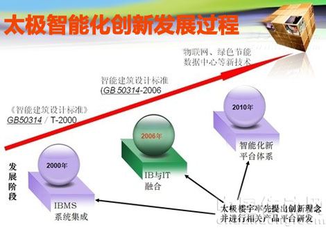到了2010年,隨著物聯網、綠色節(jié)能、數據中心等新技術的的發(fā)展,2010年太極推出了智能化新平臺體系,據了解智能化新平臺體系,能夠真正在體系架構上實現IB與IT完合融合。2010年太極智能化體系包括 以下幾個層面: