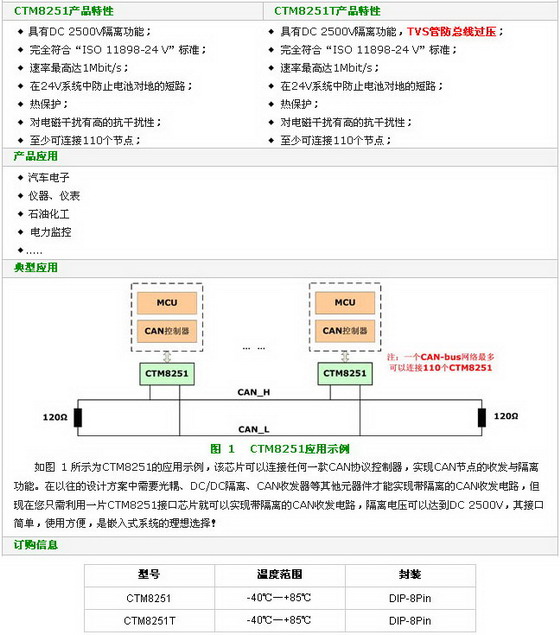 和PCA82C251一樣,該芯片符合ISO 11898標準,因此,它可以和其他遵從ISO 11898標準的CAN收發(fā)器產品互操作。 CTM8251T是在CTM8251基礎上而設計,并具有CAN-bus總線過電壓保護作用!