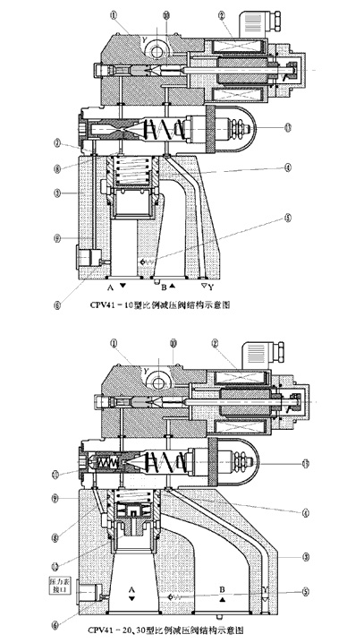 CPV41-20型和CPV41-30型這兩種閥與CPV41-10型閥工作原理相同,只是控制油是從通道(9)引入的,并在安全閥內(nèi)裝有限制控制油的流量恒定器(11),見上頁CPV41-20、30型比例減壓閥結(jié)構(gòu)示意圖。當流量等于零時,過載閥(12)可限制A腔壓力的升高,以防止閥被破壞。
