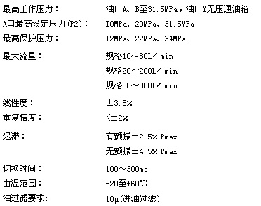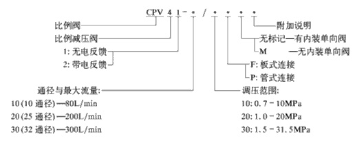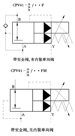 CPV41型比例減壓閥是比例先導式減壓閥,其與PA2021比例放大器配合使用時,閥A口的二次壓力P2與輸入放大器的控制電信號成正比,且P2與閥B口的進口壓力P1的波動無關(guān),因而能以連續(xù)改變電信號來連續(xù)降低系統(tǒng)中的壓力,以達到比例減壓的目的。CPV41閥A口的最高設(shè)定壓力分別為10MPa,20MPa、31.5MPa三種,并可選擇內(nèi)裝單向閥,以使反向液流自由通過。