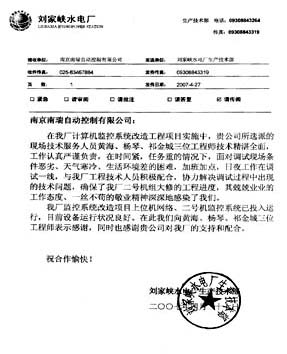 導(dǎo)語:甘肅劉家峽水電廠二號機監(jiān)控系統(tǒng)投運致南瑞自控公司感謝信