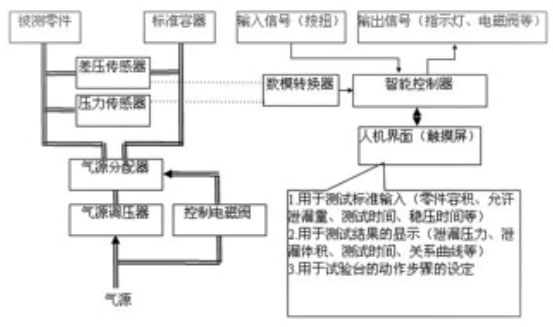 測(cè)試的基本原理是在檢測(cè)品與標(biāo)準(zhǔn)品上同時(shí)加入(或抽出)測(cè)試氣體,經(jīng)短時(shí)間氣壓穩(wěn)定后,差壓傳感器檢查出由于泄漏而使測(cè)試品與標(biāo)準(zhǔn)品之間出現(xiàn)的微小壓差變化,并以電信號(hào)方式送入微電腦進(jìn)行模數(shù)轉(zhuǎn)換,微電腦將壓差模擬量轉(zhuǎn)換為數(shù)字量并與允許泄漏值進(jìn)行定時(shí)逐點(diǎn)比較,微電腦根據(jù)比較結(jié)果輸出相應(yīng)信號(hào),以示測(cè)試結(jié)果合格或不合格。