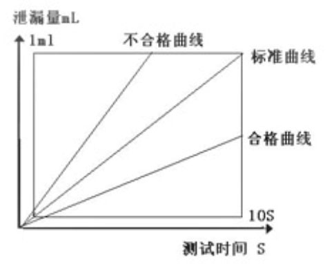 例如:假設(shè)測(cè)試時(shí)間為10秒,允許泄漏為1毫升,那么測(cè)試時(shí)間與允許泄漏量關(guān)系為標(biāo)準(zhǔn)直線方程,其圖形為: